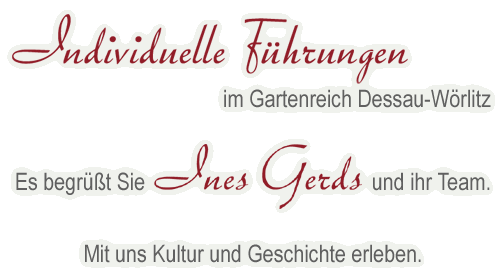 Führungen im Gartenreich * Stadt- und Parkführungen in Wörlitz, Oranienbaum, Dessau und Wittenberg * Radwanderungen Thematische und Literarische Führungen * Reiseleitung im Gartenreich und in der Region Anhalt - Wittenberg